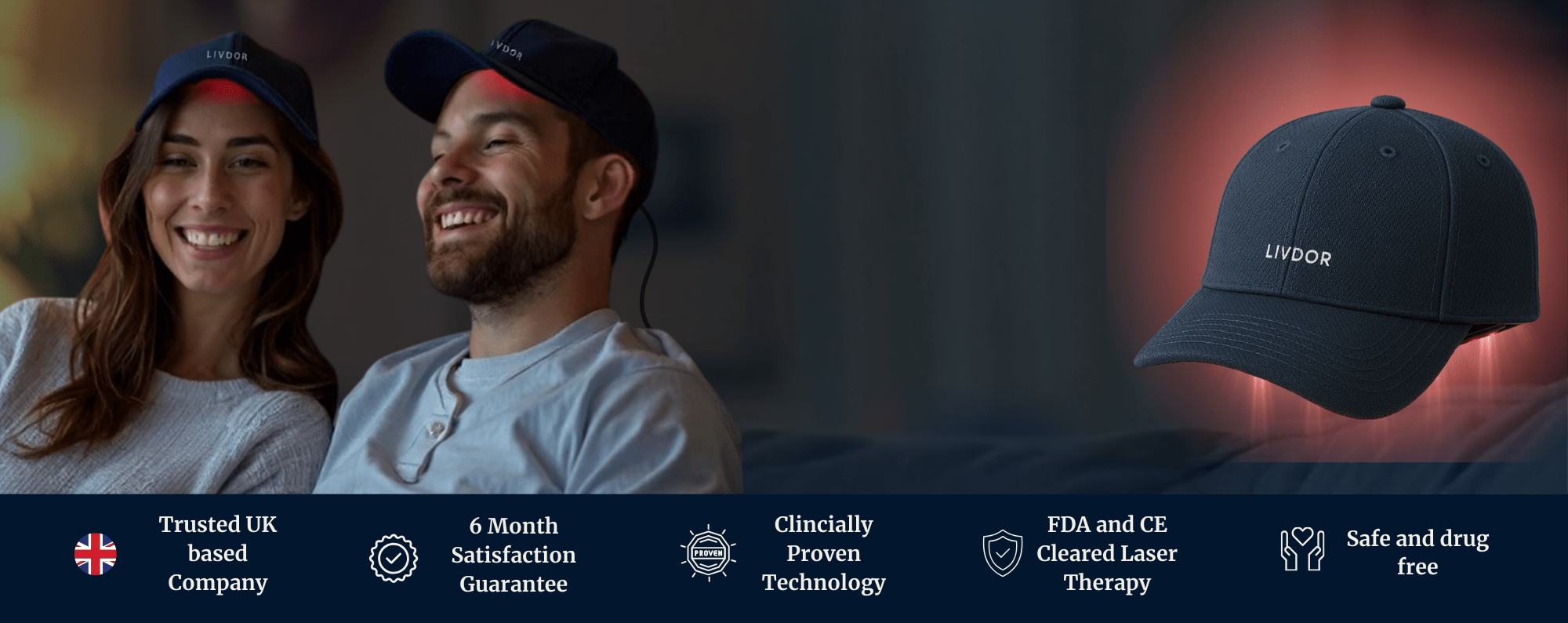 The LIVDOR Laser Cap is designed to help men and women experiencing early to moderate hair thinning, whether at the crown, temples, or part line. It’s most effective when hair follicles are still active, making it ideal for androgenetic hair loss (male/female pattern baldness), postpartum shedding, and stress-related thinning. If you’re unsure, feel free to contact us we’re happy to help you decide if it’s right for your hair type and stage.