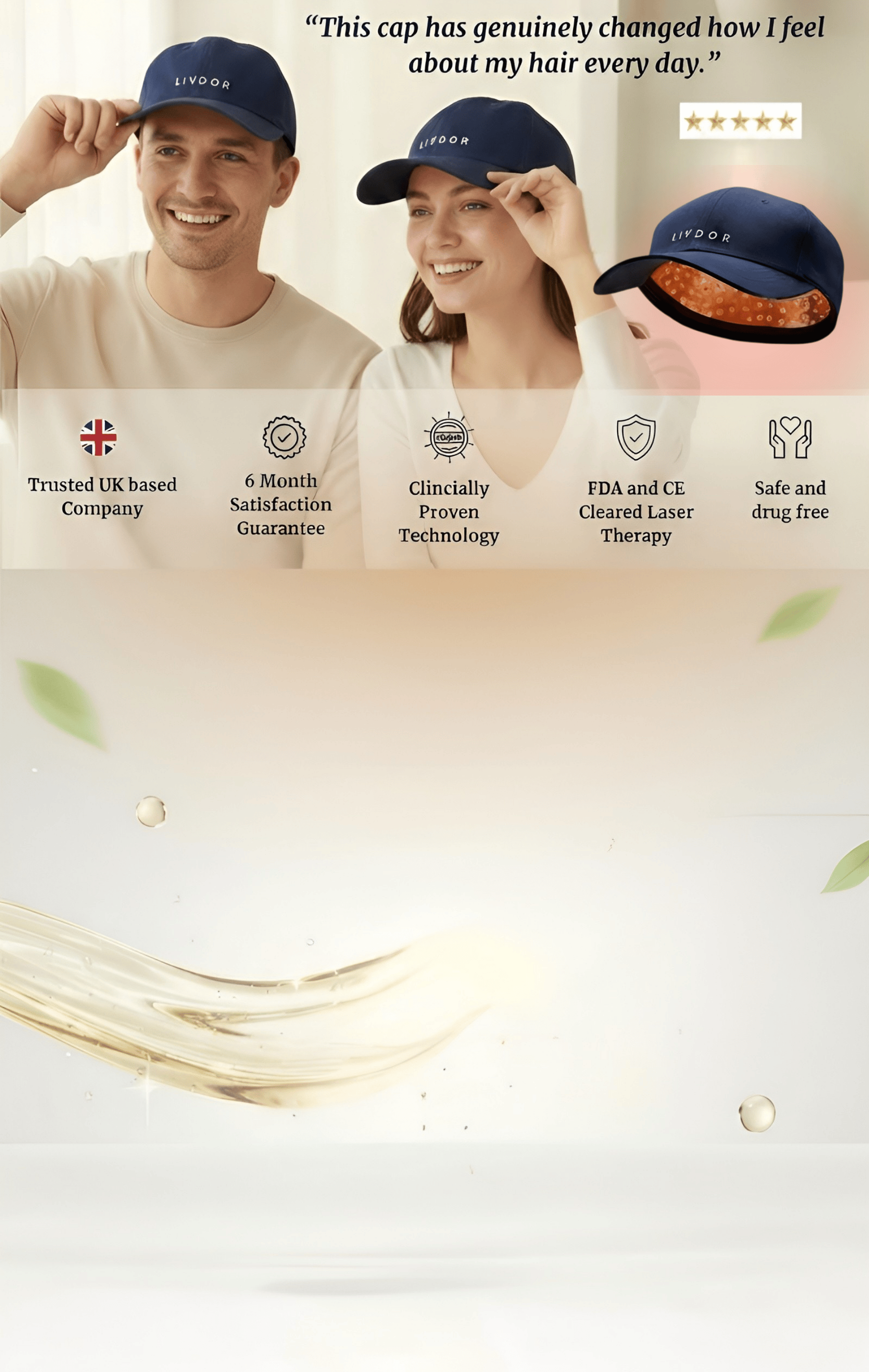 Absolutely. The LIVDOR Laser Cap uses 272 medical-grade lasers, not LEDs, to deliver red light directly to your hair follicles a method known as Low-Level Laser Therapy (LLLT). This technology has been widely studied and is clinically backed for treating hair loss in both men and women. It’s non-invasive, drug-free, pain-free, and has no known side effects when used as directed.