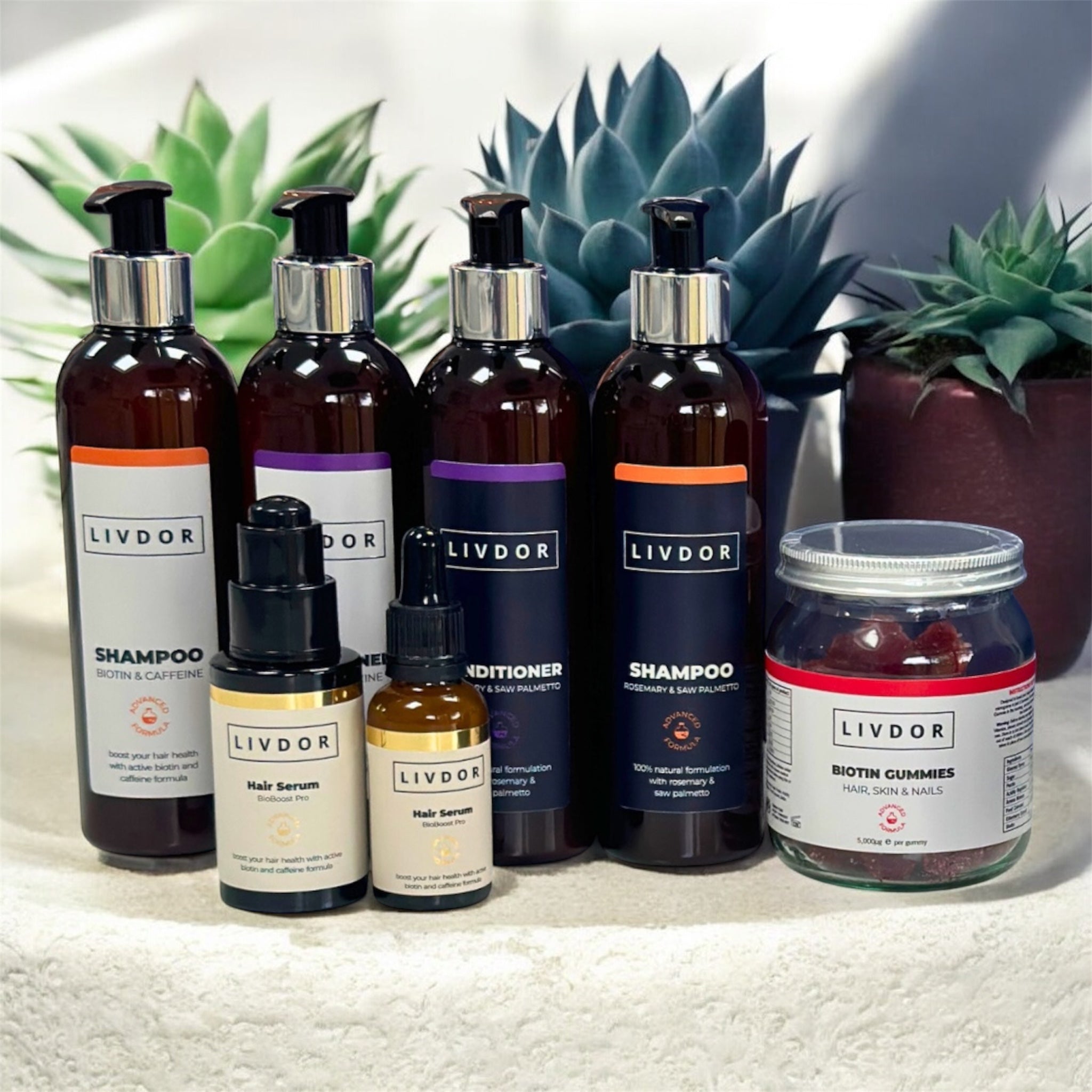 - High quality Shampoo, Conditioner, Serum and Gummies.