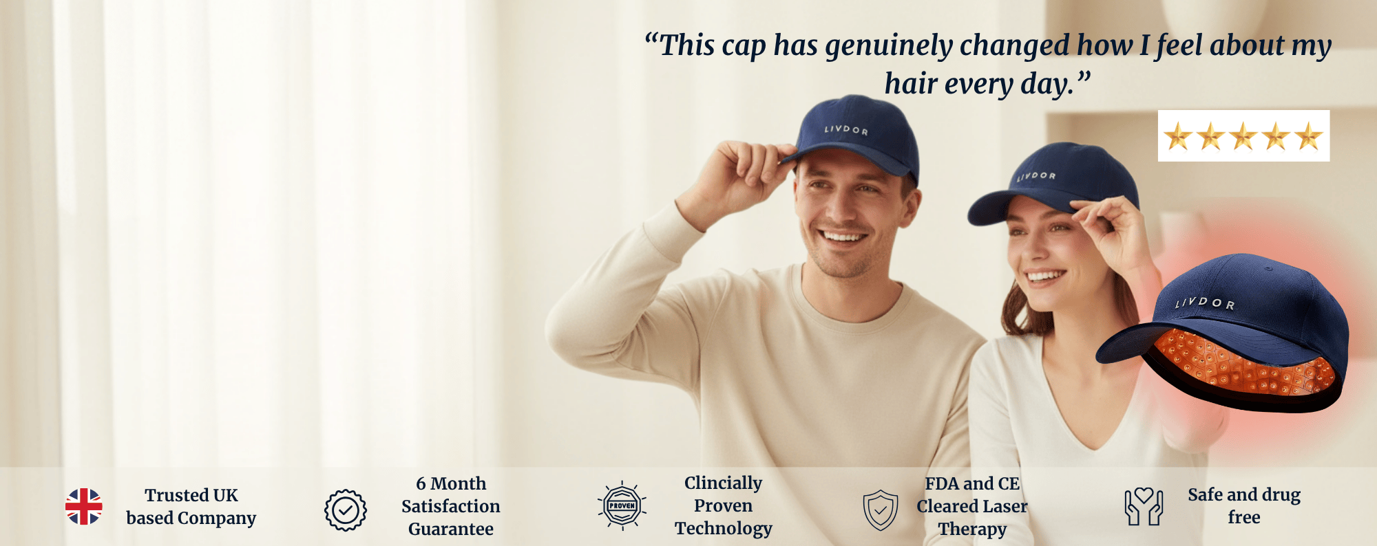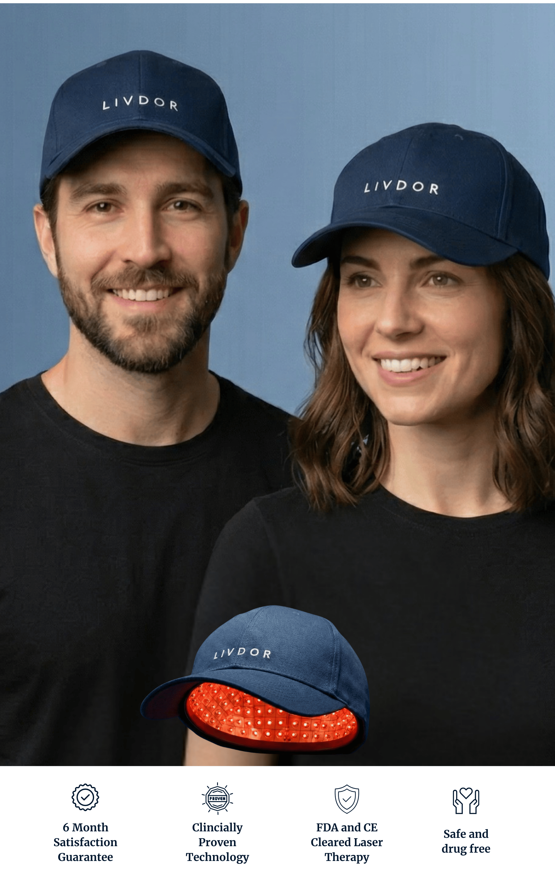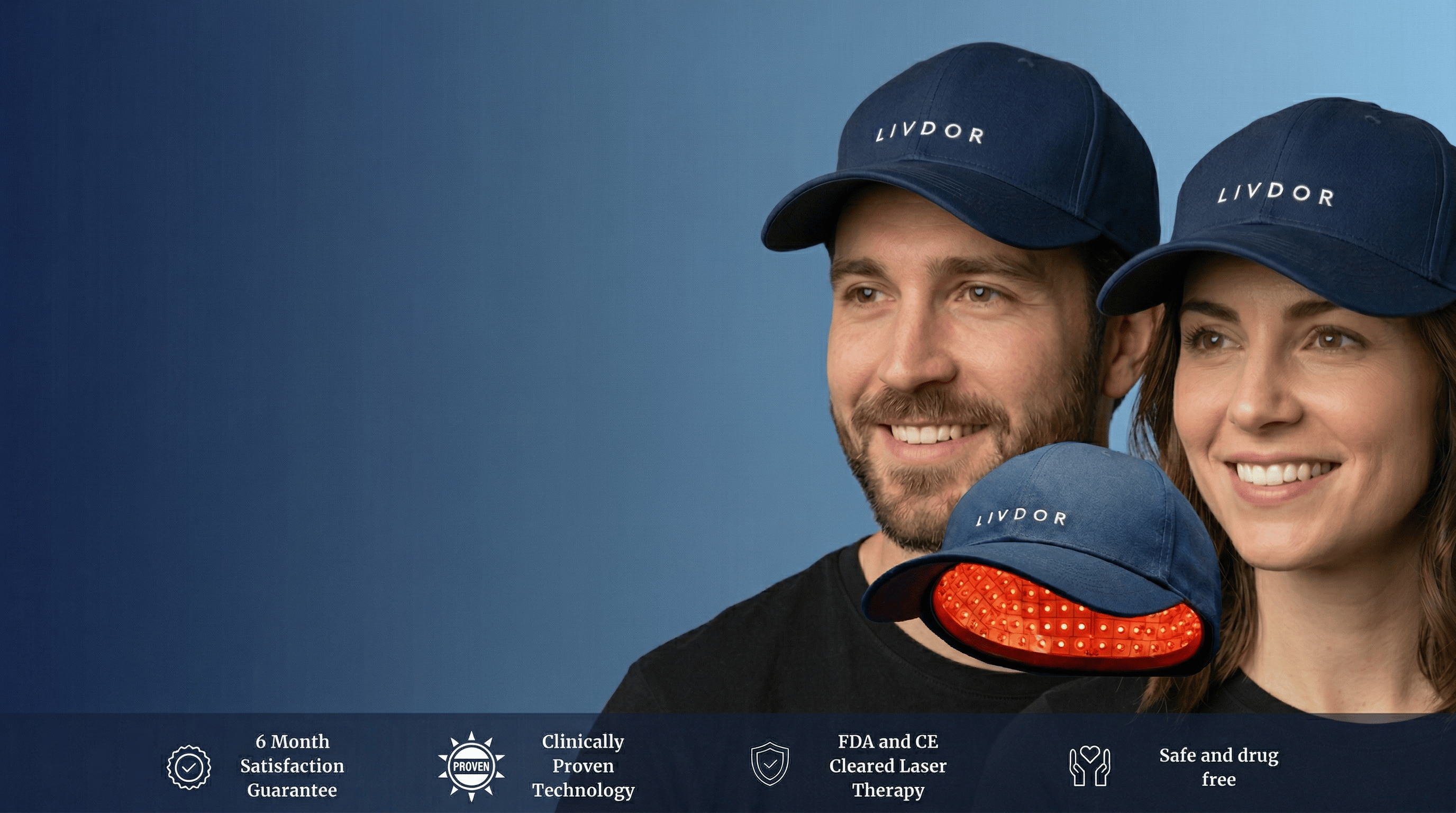 Absolutely. The LIVDOR Laser Cap uses 272 medical-grade lasers, not LEDs, to deliver red light directly to your hair follicles a method known as Low-Level Laser Therapy (LLLT). This technology has been widely studied and is clinically backed for treating hair loss in both men and women. It’s non-invasive, drug-free, pain-free, and has no known side effects when used as directed.