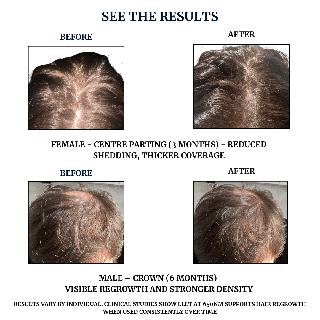 Results vary by individual, but many customers begin to notice reduced shedding within the first 12 weeks. Visible thickening and regrowth typically appear in months 4-6, with optimal results after 12 months of use. Like any hair growth system, consistency is key and combining the Laser Cap with the LIVDOR Ultimate Bundle (Shampoo, Conditioner, Serum & Gummies) supports even stronger, fuller results over time.